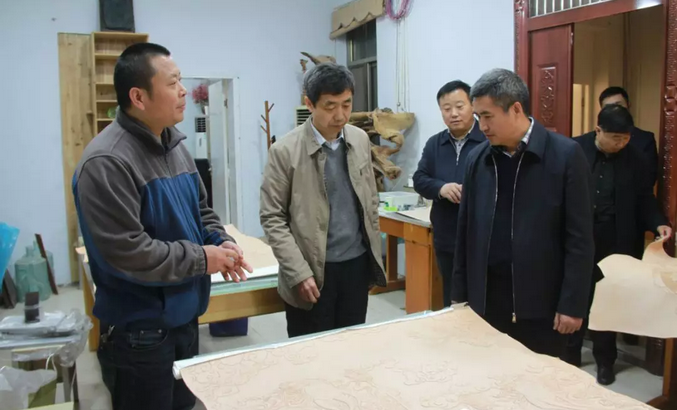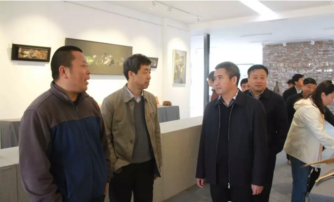 在漆画、版画、雕塑等文创作品前,冉献东详细介绍了公司在应用型、创新型专业人才培养方面充分发挥课堂理论知识与社会实践实训的统一结合,积极融入本土商文化特色创新、创意创作理念的文创作品。在漆画工作室、木雕工作室,创新创意实训工厂,薛天江与正在创作的师生在创作流程、设计理念以及文创生产线生产流程等方面进行了详细交流。