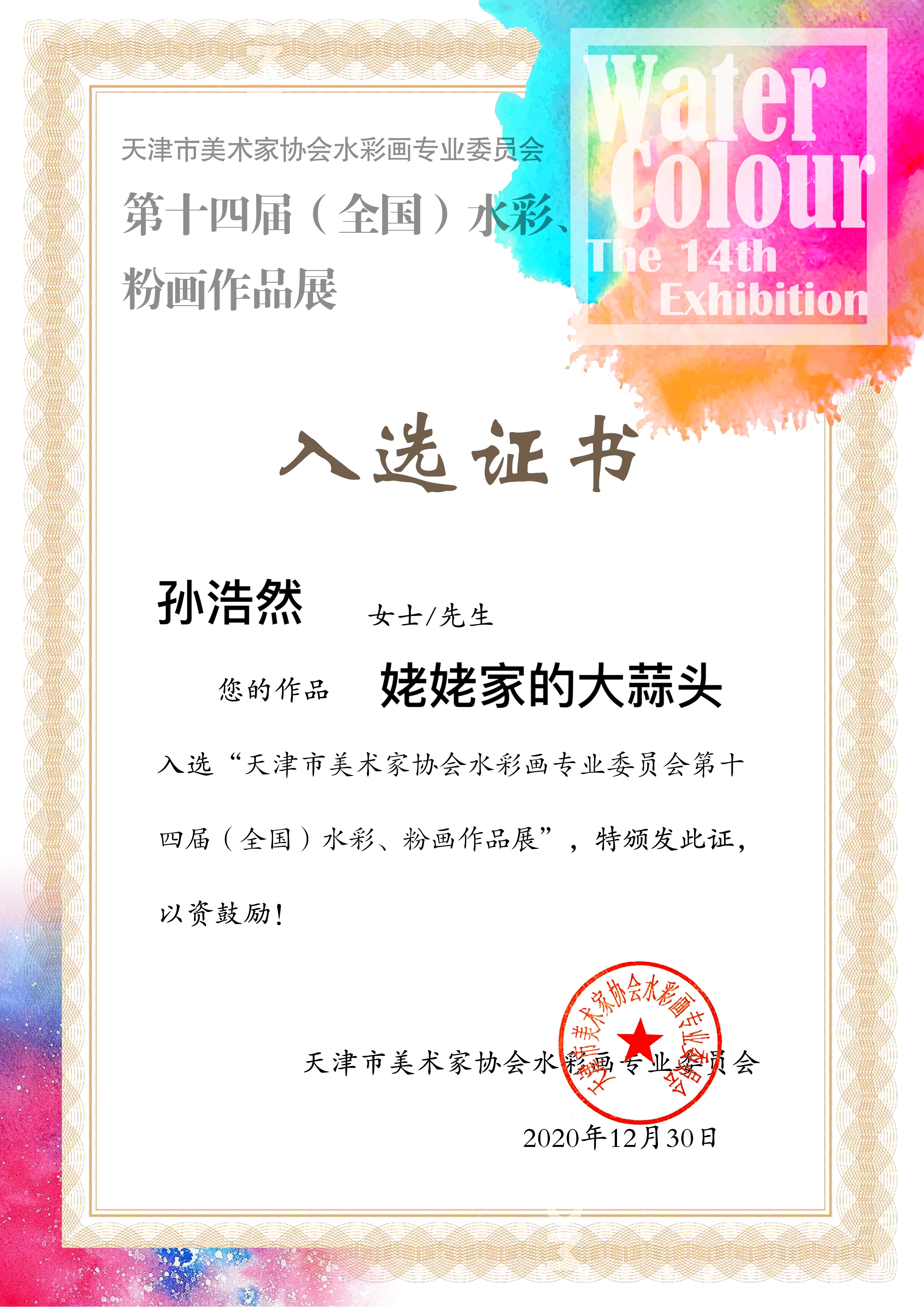 2020年 作品入选第十四届(全国)水彩粉画作品展