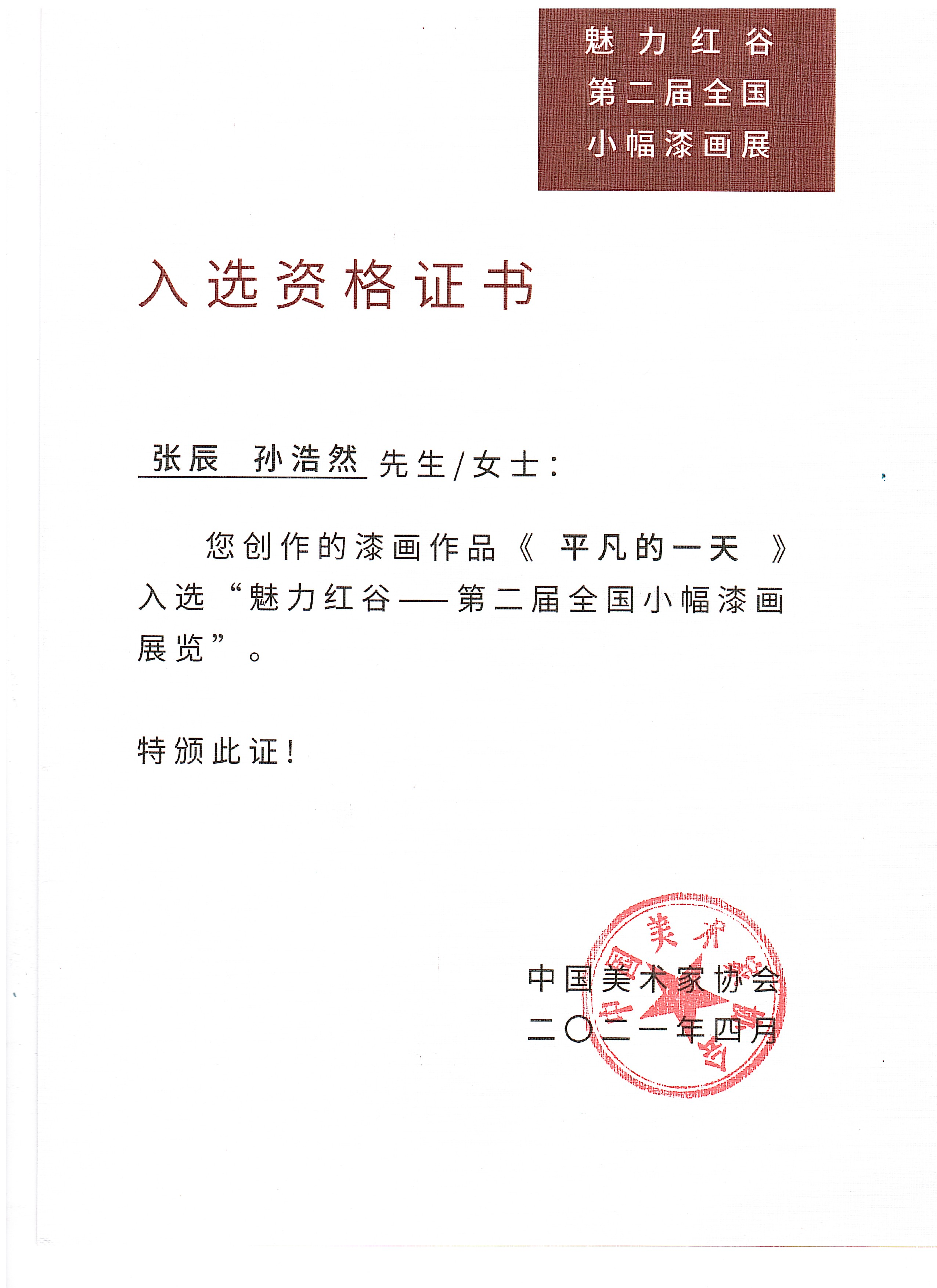 2021年 作品获由中国美术家协会举办的第二届全国老员工美术作品展入会资格