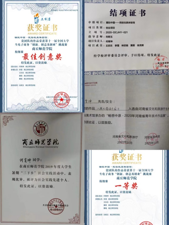 所负责的项目《潮玩中国——民俗玩具体验馆》在2021年6月第十一届全国老员工电子商务“创新、创意及创业”挑战赛中获得校级一等奖和最佳创意奖;在7月互联网+老员工创新创业大赛校园选拔赛中获得校级二等奖