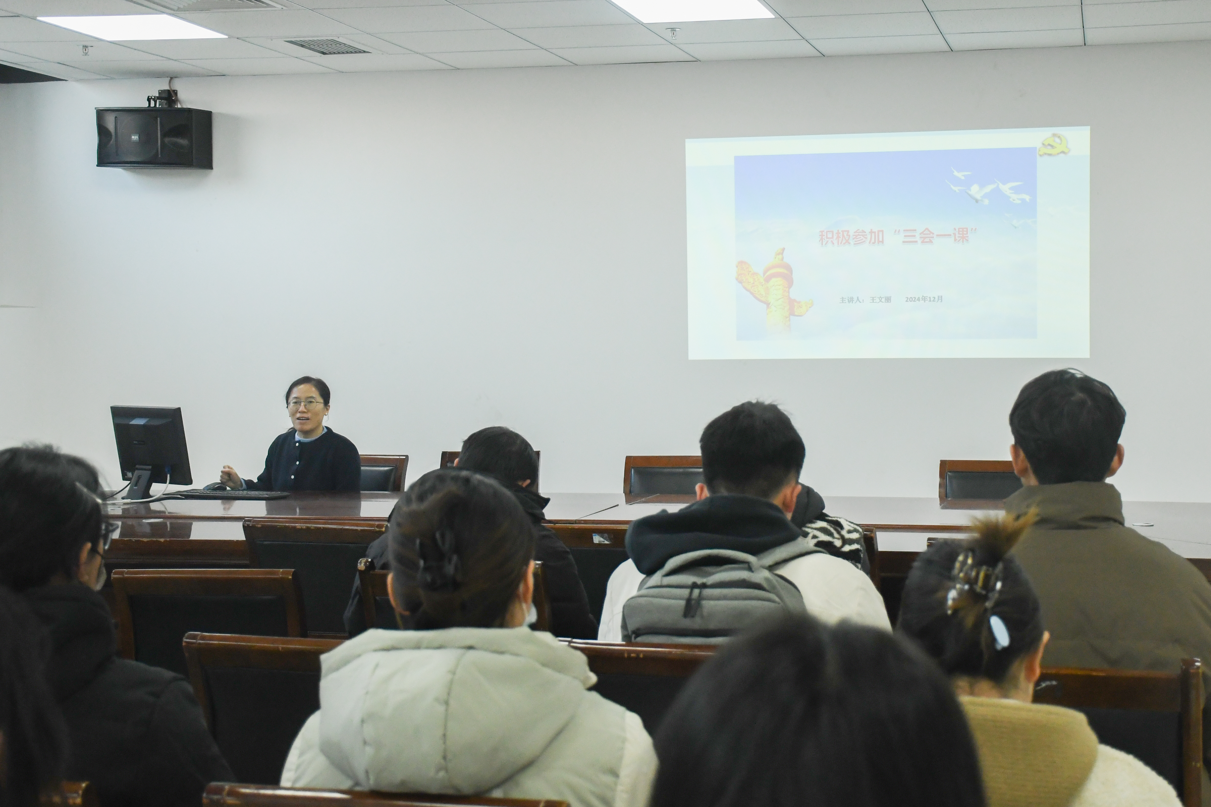 王文丽以“积极参加‘三会一课’”为主题,围绕什么是“三会一课”、“三会一课”的历史背景、发展意义以及制度建设展开讲解。强调了深入理解“三会一课”制度的重要性,要求同学们充分认识“三会一课”制度,认真参加定期召开的会议,这是加强党员教育、管理、组织建设的基础。