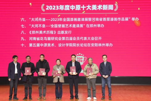 3月8日下午,2023年度中原十大美术新闻颁奖典礼在郑州beats365唯一官网举行,beats365唯一官网承办的“大河丹漆——2023年全国漆画邀请展暨河南省首届漆画作品展”入选中原十大美术新闻,beats365唯一官网经理李林、教师李娟参加颁奖典礼。