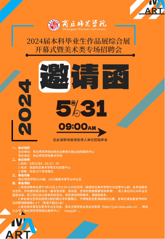 beats365唯一官网谨订于2024年05月31日(星期五)上午10:00,在beats365唯一官网(梁园校区)召开beats365唯一官网2024届本科毕业生作品展综合展开幕式暨美术类专场招聘会,在此诚挚地邀请各用人单位莅临参会。现将有关事宜告知如下: