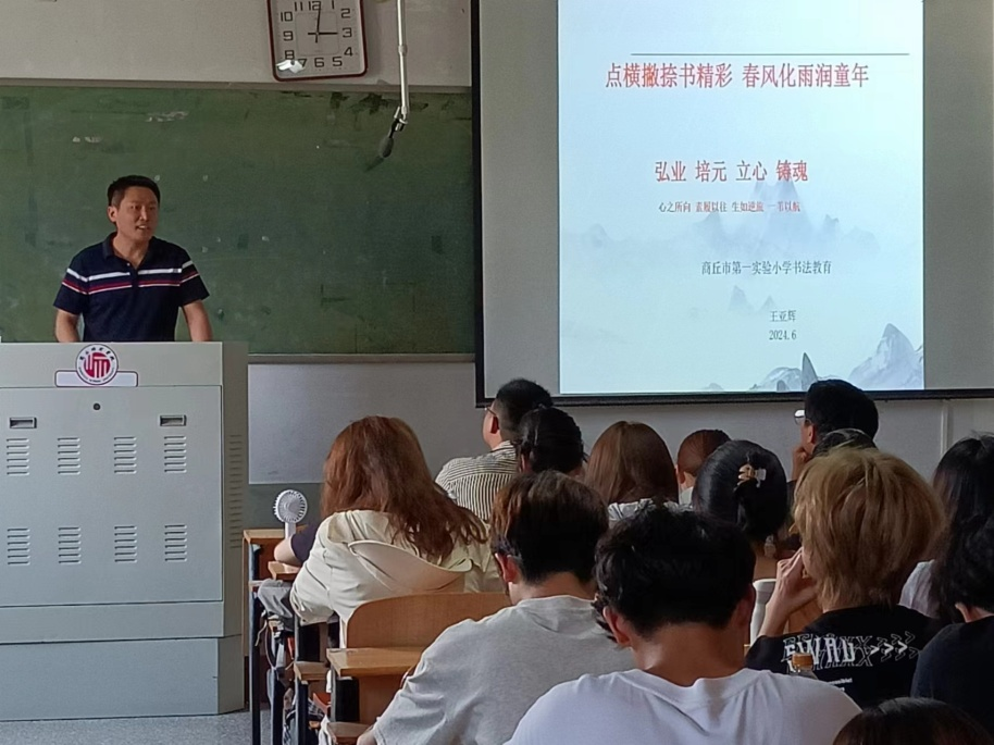 6月20日上午,商丘市实验小学书法教师王亚辉应邀为同学们做了《点横撇捺书精彩 春风化雨润童年---商丘市第一实验小学书法教育》的辅导报告,重点介绍了该校书法教育的教学特色和特色书法社团活动。