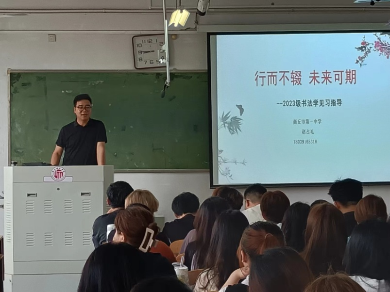 动员会后,公司邀请商丘市第一中学书法教师赵占礼为同学们做了《行而不辍未来可期——2023级书法学专业见习指导》的辅导报告。他从商丘市一中的办学历史、校园环境、书法教师的日常教学工作、书法社团活动和书法教师必备修养等方面进行了详细介绍,并与同学们就中学书法教学的具体问题进行了交流。