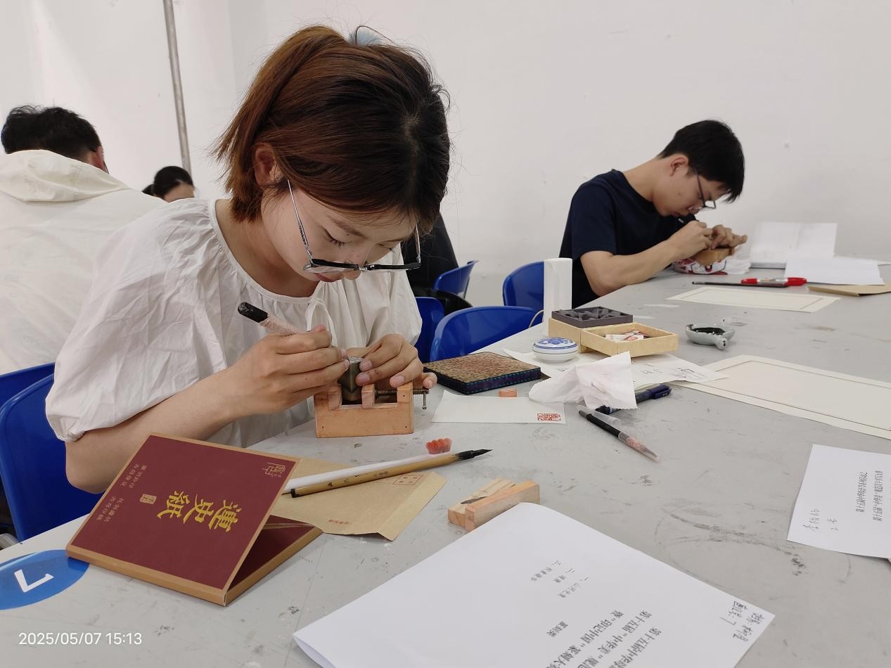 大赛设立软笔书法、硬笔书法及篆刻三大类别,分设专业组与业余组五个赛区。软笔赛场翰墨飘香,楷书之端庄、行书之飘逸、隶书之古朴相映成趣;硬笔区域笔锋流转,既有《少年中国说》的工整誊录,也不乏诗词排版的艺术创新;篆刻台前刀石相击,“山河光复”“积素凝华”等印文在方寸之间尽显匠心。参赛者通过笔墨丹青与金石篆刻,生动诠释新时代青年的文化创造力。