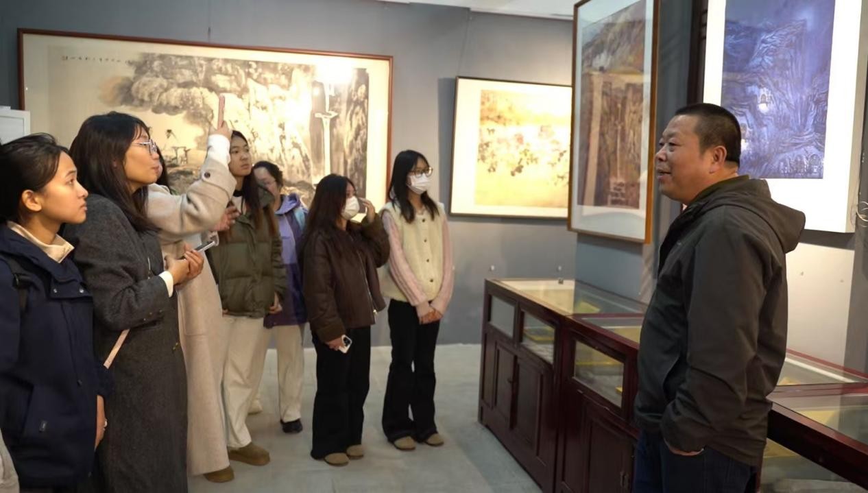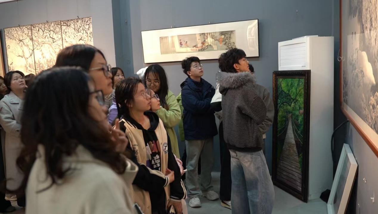 步入展厅,同学们立刻被浓郁的艺术氛围所包围。在冉献东教授的引导下,同学们有序参观了各个展区。从气势恢宏的写意山水到精雕细琢的工笔花鸟,从苍劲有力的金石书法到充满时代气息的现代油画,每一幅作品都仿佛在诉说着一个独特的故事。同学们时而驻足凝视,揣摩画家的技法与构图巧思;时而低声交流,探讨作品背后的艺术理念与情感表达;时而拿出手机,认真记录下打动自己的精彩瞬间。同学们纷纷表示此行收获巨大,受益匪浅。