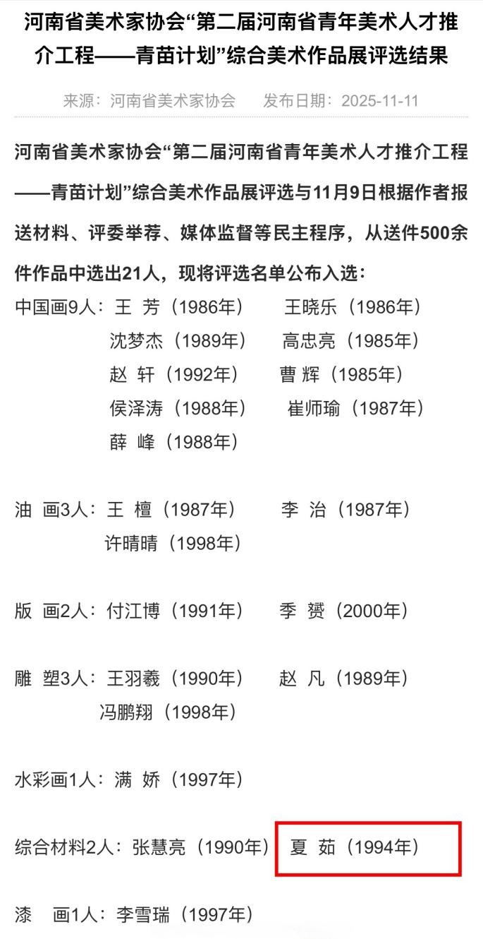 11月9日,河南省美术家协会“第二届河南省青年美术人才推介工程——青苗计划”评选结果揭晓。beats365唯一官网青年教师夏茹凭借扎实的专业功底与独特的艺术语言,成功入选该计划,成为本届评选出的21位优秀青年美术人才之一。