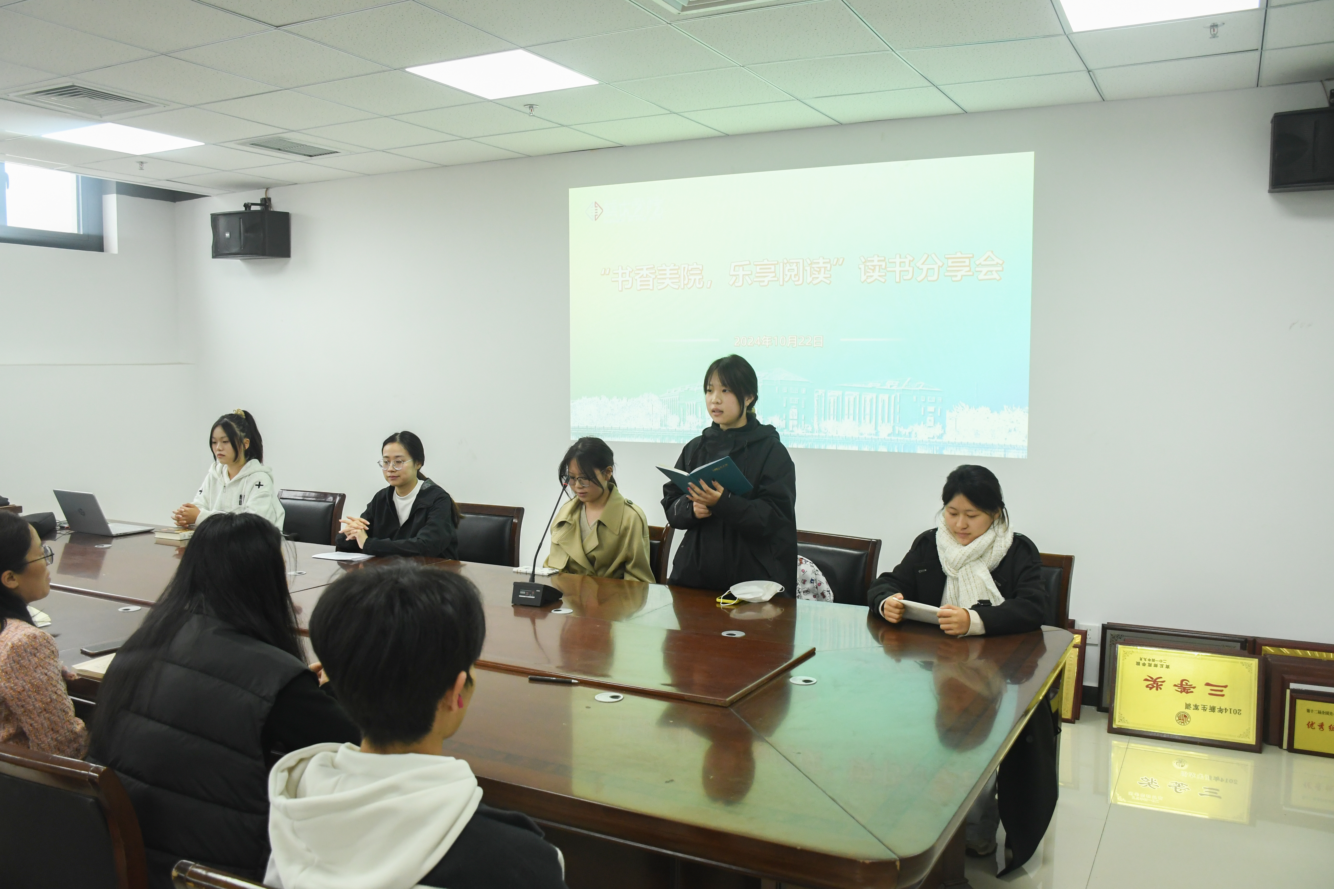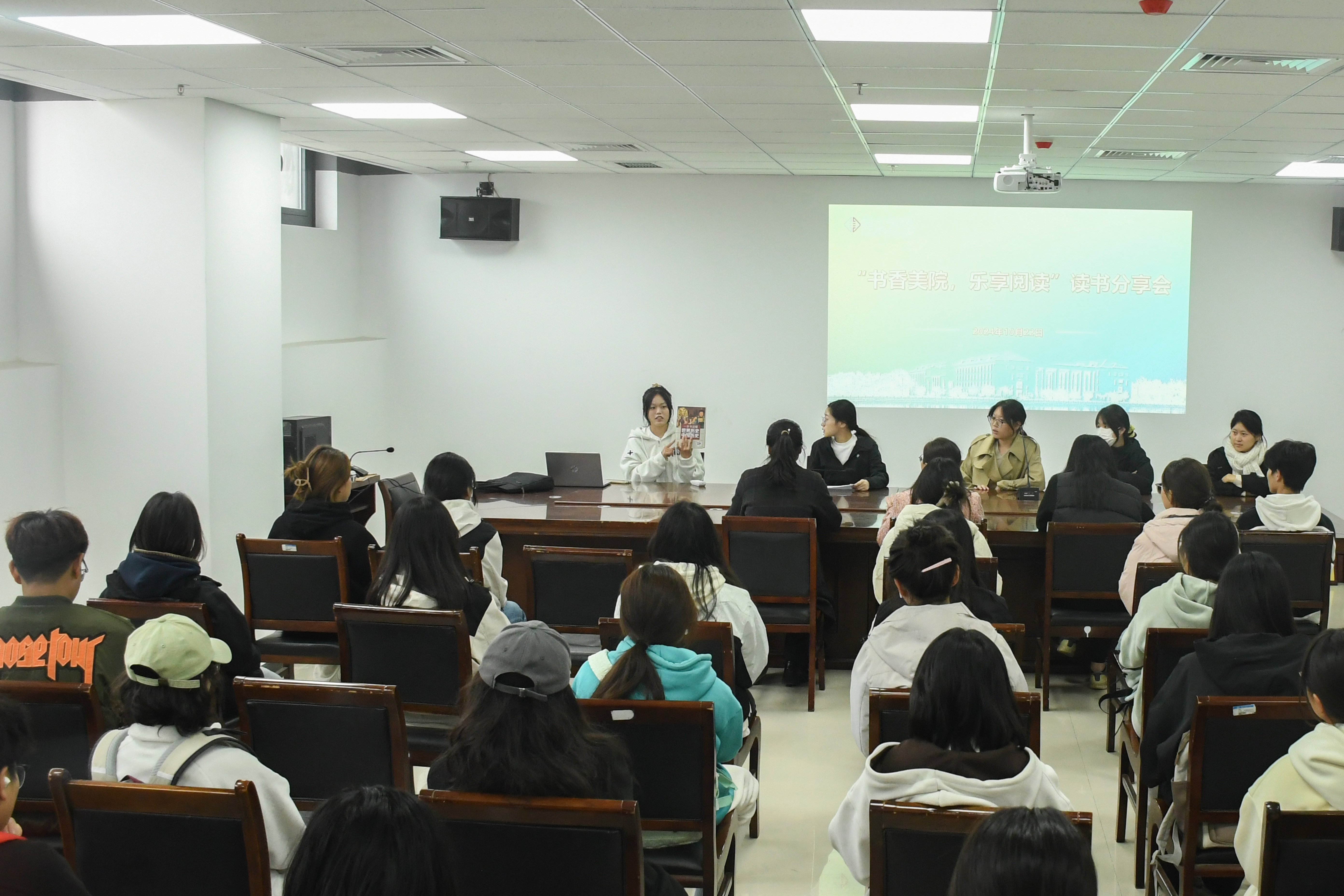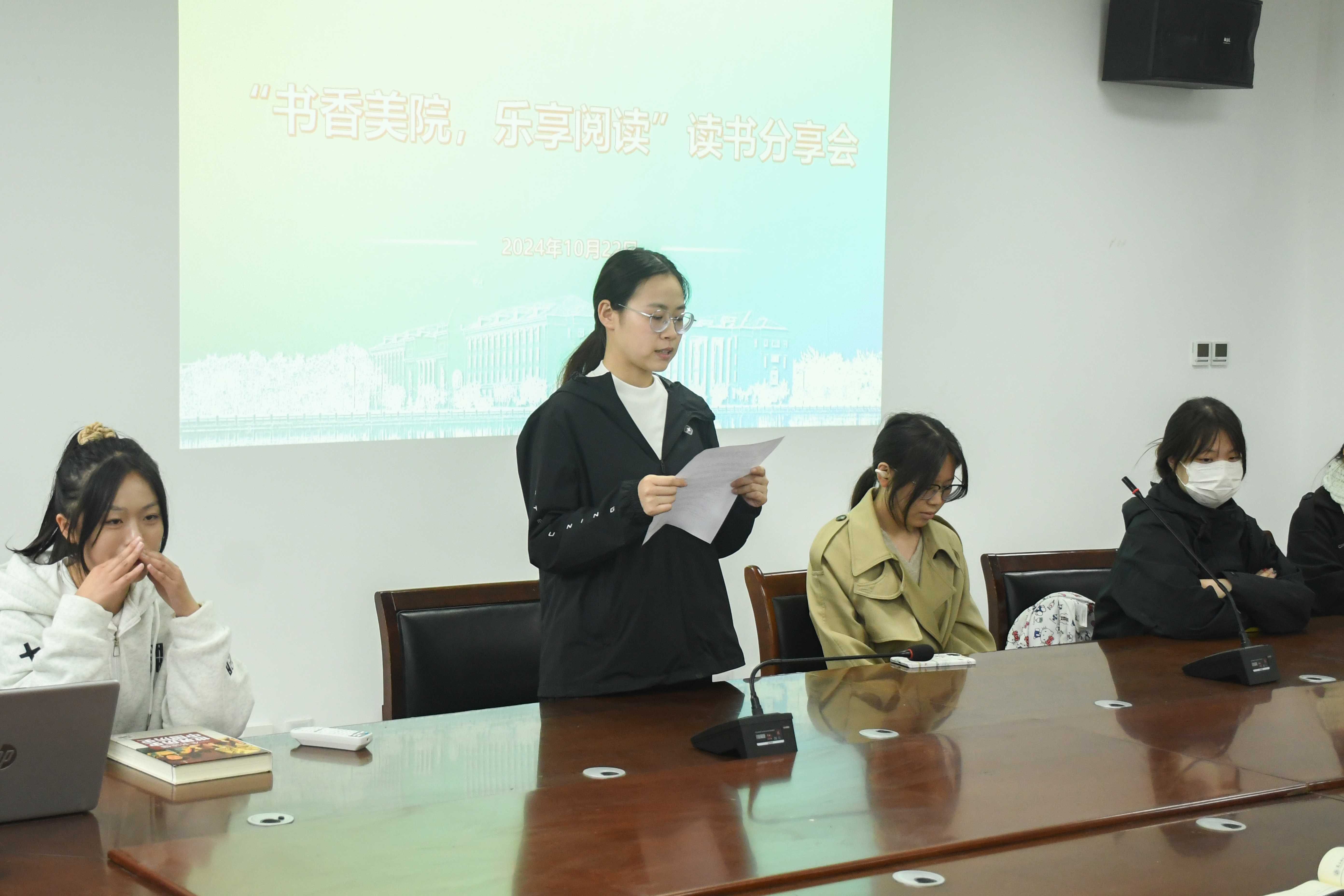 24级员工张博文、王露谕、李元新、陈璐瑶、赵丁羽热情洋溢地分享了自己的读书心得和感悟。分享过程中介绍了推荐的书目及内容,从不同角度畅谈了自己的所思所想、所感所悟,同时也分享了自己的读书方法和读书故事,激发了同学们对阅读的热情,拉近了各专业同学彼此之间的距离。