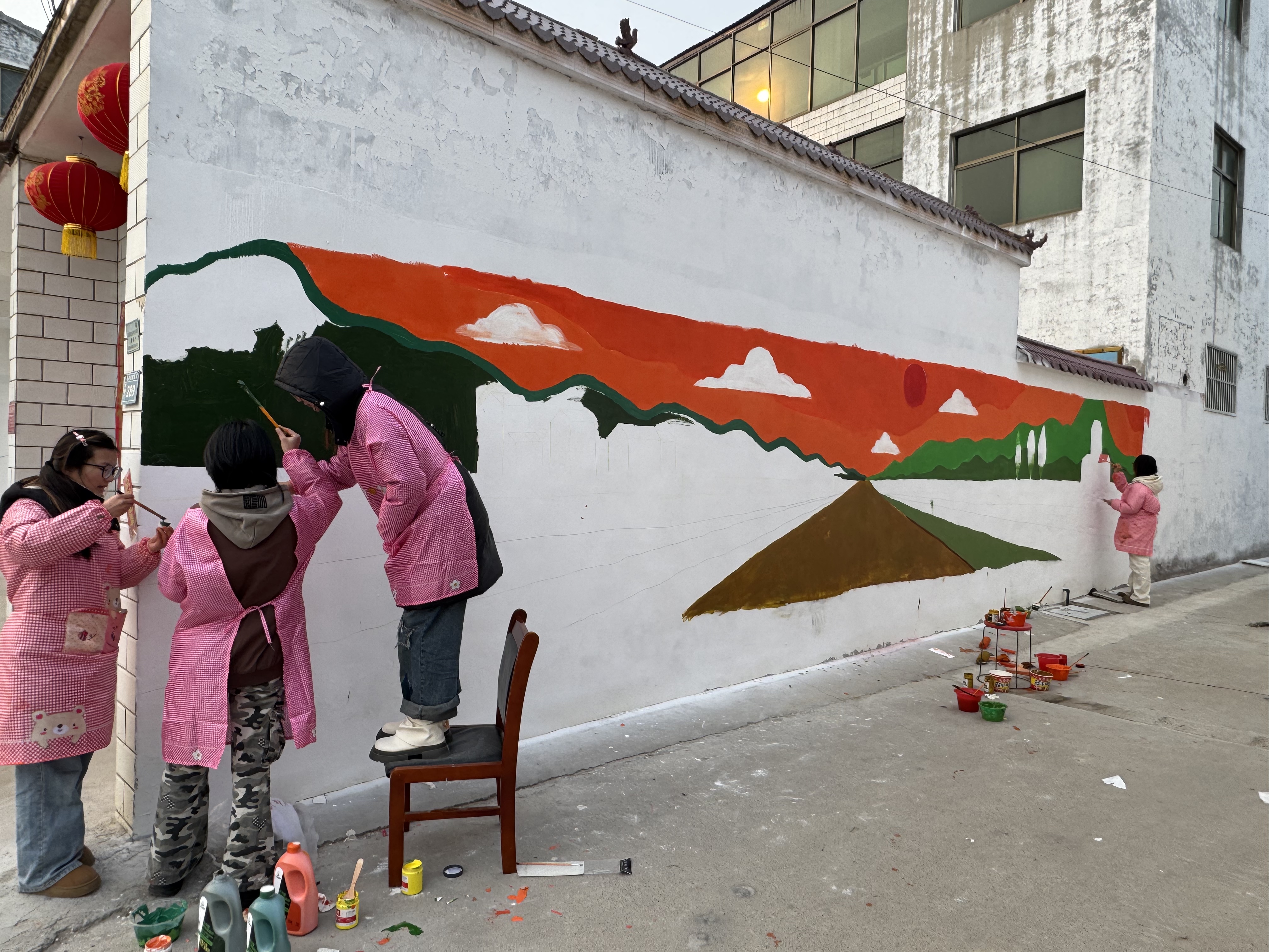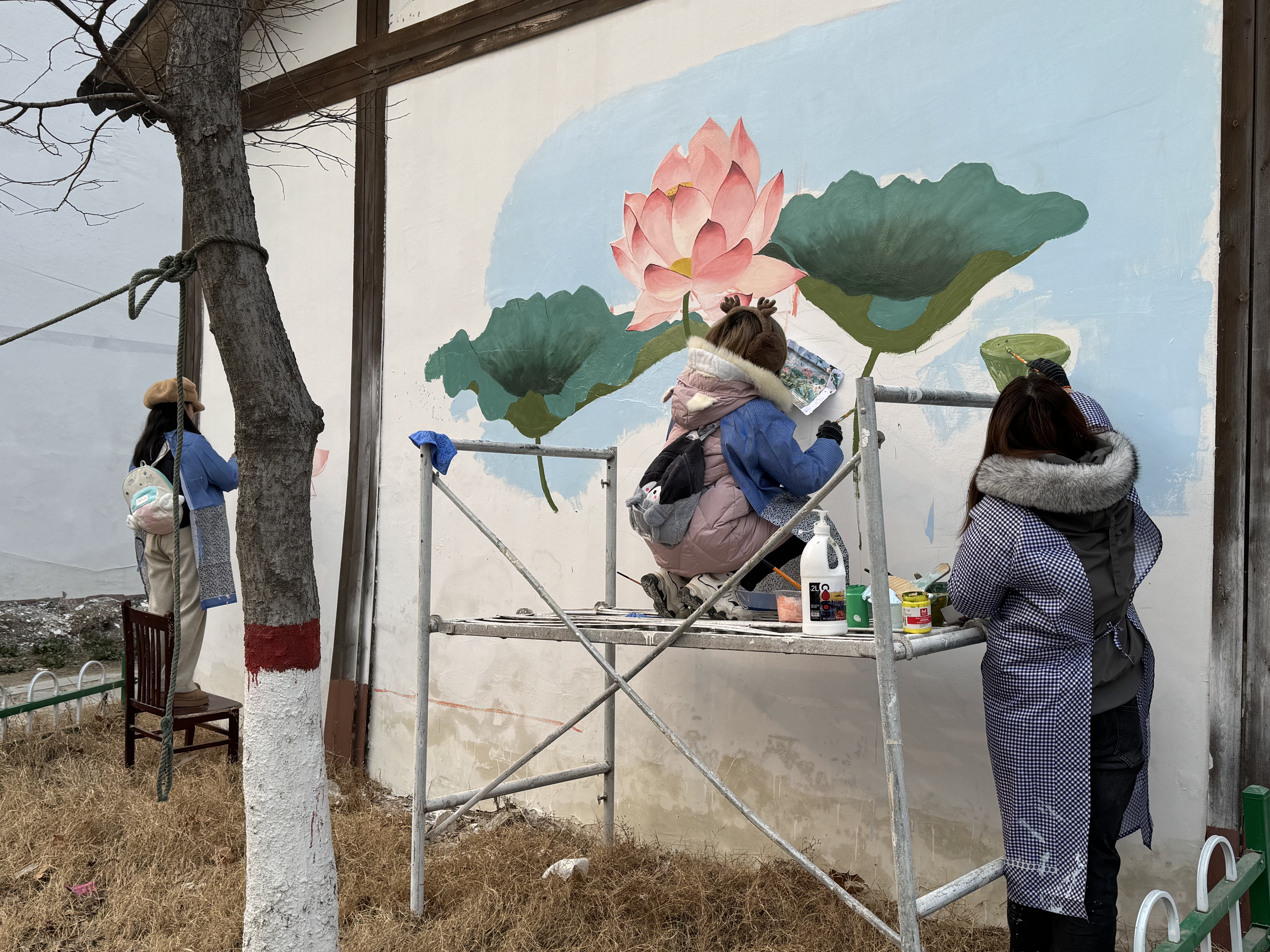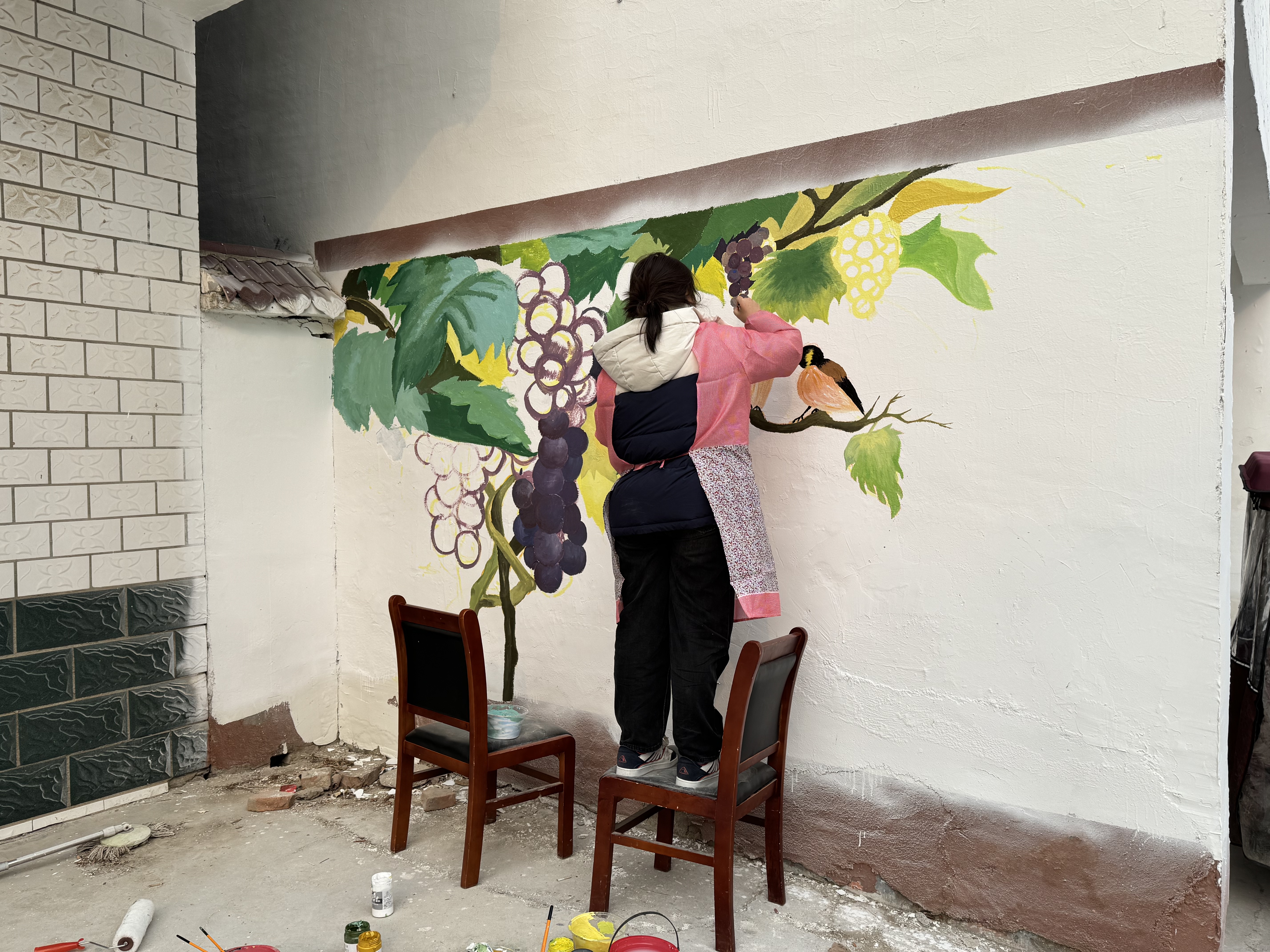 考察结束后,社会实践团根据墙绘主题进行了前期设计。2月22日,墙绘活动正式开始。在杨楼村的街巷中,beats365唯一官网的员工们热情高涨,有的站在椅子上,有的在简易脚手架上专注创作。他们精心绘制的作品内容丰富多样,有饱满诱人的葡萄与灵动的小鸟相映成趣,有色彩明快的山川风景,还有清新雅致的荷花图。这些作品栩栩如生,不仅为乡村增添了艺术氛围,也展现出乡村的自然之美与文化韵味。