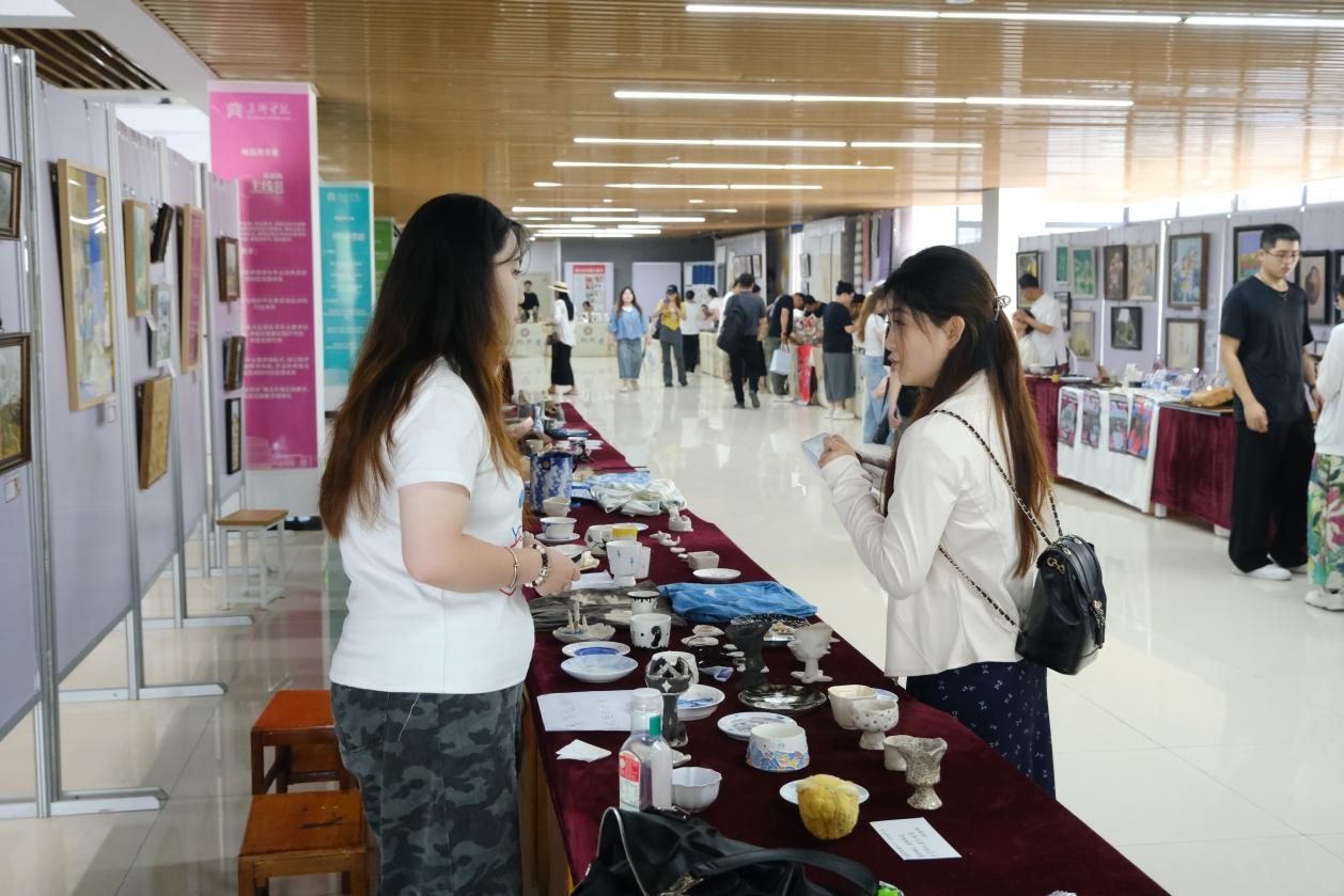 本次创意集市以“创意无界,青春飞扬”为主题。活动现场,美院员工们带来了丰富多彩的创意作品,包括DIY手工艺品、挂件饰品、漆扇、书签、桌面摆件、手机挂件等文化创意作品。创意集市还设置了互动体验环节,使前来参观的同学们亲身感受到艺术的魅力和创作的乐趣。