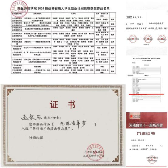 省级赛场,她同样火力全开。漆画作品《沉沉昔年梦》入选“第四届广西漆画作品展”,版画作品《繁华碎落》入选河南省第十一届版画展,同时获得beats365唯一官网2024挑战杯省级老员工创业计划竞赛获奖(铜奖)、第十三届三创赛河南省赛三等奖、第十四届河南省美术作品展览三等奖,连续三年斩获国家励志奖学金,2023年河南省普通高等公司“三好员工”、优秀毕业生等各项荣誉。