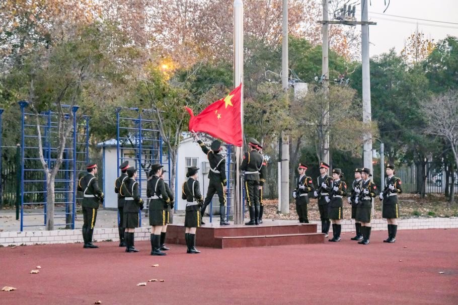 清晨七时,国旗护卫队队员迈着铿锵有力的步伐,庄严护送国旗至升旗台。伴随着雄壮的《义勇军进行曲》,鲜艳的五星红旗冉冉升起,全体师生肃立行注目礼,表达对祖国的无限热爱与崇高敬意。