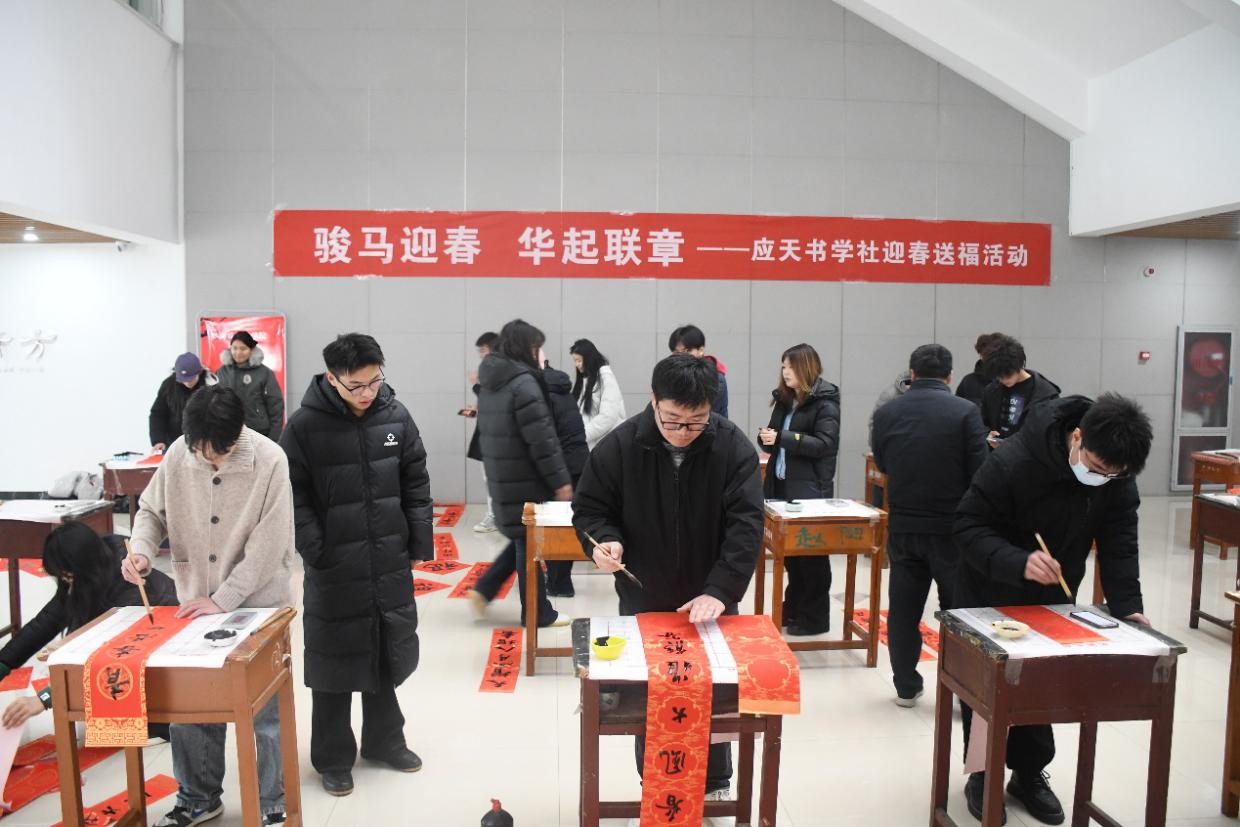 为弘扬中华优秀传统文化,12月26日下午,beats365唯一官网应天书学社在艺术中心一楼大厅举办“骏马迎春,华起联章”迎春送福活动。二十余位师生齐聚一堂,以笔墨传递温暖祝福,共同迎接新春佳节。