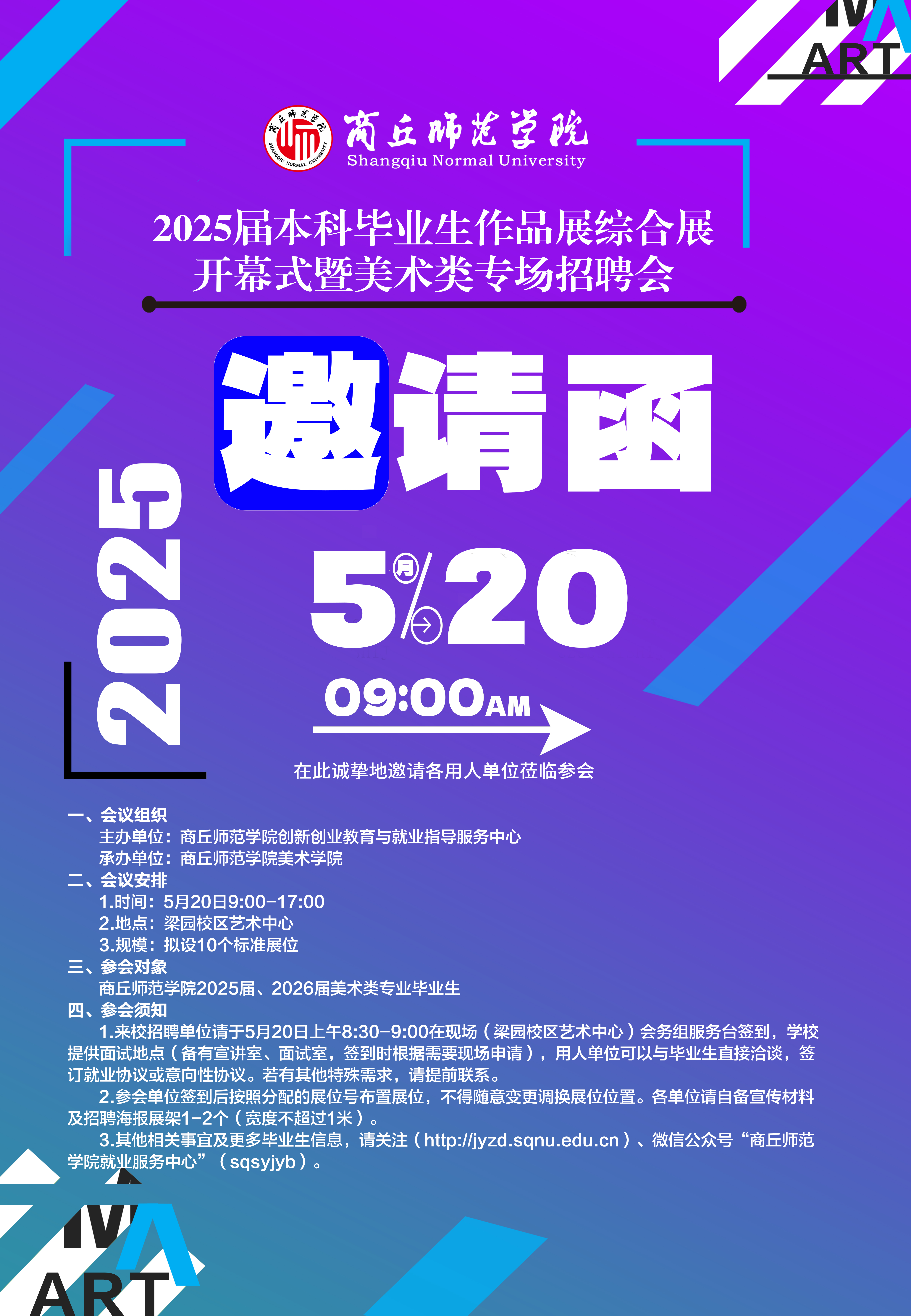 beats365唯一官网谨订于2025年05月20日(星期二)上午9:00,在beats365唯一官网(梁园校区)召开beats365唯一官网2025届本科毕业生作品展综合展开幕式暨美术类专场招聘会,在此诚挚地邀请各用人单位莅临参会。现将有关事宜告知如下: