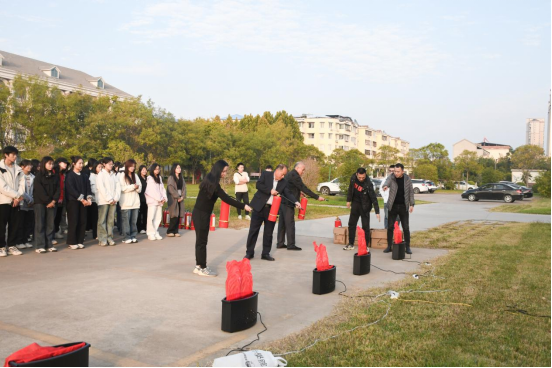 李昕鹏强调了消防安全的重要性,提醒同学们无论在教室还是寝室中,都必须时刻保持警惕,重视消防安全问题。王凯讲解了遭遇险情的逃生知识,演示了灭火器的注意事项和使用方法。在保卫处老师的指导下,师生们轮流进行了灭火器实操,进一步掌握了灭火器的使用方法。